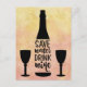 Ahorra Agua, Bebe Vino. Únete a un movimiento de conservación del agua que hace del mundo un lugar más feliz. Nuestro diseño de botellas de vino y copas de vino de corcho se presenta sobre un suave fondo de color amarillo y melocotón.
