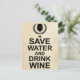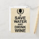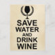 Ahorra agua y bebe vino. Es un pedido humorístico para salvar el agua, basado en el omnipresente poster "Mantener la calma" presentado por el gobierno británico en 1939. Este diseño se presenta sobre un fondo de papel envejecido. Puede eliminarse fácilmente y reemplazarse con un arcoiris de opciones de color claro.