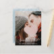 Esta moderna foto de guión permite guardar la tarjeta de fecha con copos de nieve de invierno que caen sobre tu foto especial con un guión elegante guardar la fecha por encima de tus nombres, fecha y lugar en texto blanco. El reverso tiene detalles adicionales de guardar la fecha, incluido el sitio web del boda, con la dirección de devolución y el espacio para la dirección del destinatario. Diseñado por Thisisnotme©