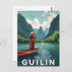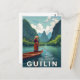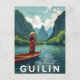 Embark on a visual journey with this captivating vintage-style travel poster postcard featuring Guilin, China. The artwork beautifully depicts the serene Li River winding through the iconic karst mountains, a hallmark of Guilin's breathtaking landscape. A lone figure in a traditional conical hat (dǒulì) gracefully poles a wooden boat, embodying the timeless tranquility of this scenic region. The cool, refreshing color palette of greens, blues, and distant purple mountains captures the misty, picturesque atmosphere. Perfect for travel enthusiasts, collectors of retro Asian art, or anyone enchanted by the natural beauty and culture of China.
