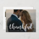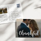 Una tarjeta postal moderna y elegante de agradecimiento diseñada para acomodar tu foto boda horizontal o paisajista favorita con "agradecimiento" como un guión de caligrafía blanca. Personalice con sus nombres y/o fecha de boda debajo. Las postales se invierten para mostrar su dirección de retorno con amplio espacio para el direccionamiento del destinatario, así como un mensaje preimpreso opcional y una foto adicional. Si prefiere agregar un mensaje manuscrito, simplemente elimine el texto de ejemplo que se muestra.