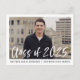Elegantes y modernas postales de invitación a la fiesta de graduación con la foto del graduado enmarcada en blanco con la "Clase de 2025" en un sobre de escritura de brocha blanca y acuarela. Personalice el frente agregando el nombre del graduado y el nombre de la escuela en texto negro. La invitación se invierte para mostrar la dirección de retorno y los detalles de la fiesta de graduación en texto negro.