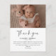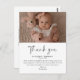 Expresa tu sincera gratitud con esta elegante tarjeta postal de agradecimiento a tu bebé, la manera perfecta de agradecer a tus seres queridos por su amabilidad y presencia en tu celebración. Esta hermosa tarjeta presenta una preciosa foto de tu recién nacido en la mitad superior, mientras que la parte inferior muestra un reflexivo mensaje de agradecimiento, resaltado por "Gracias" en un sofisticado y elegante guión. Personalizar fácilmente el texto y la imagen haciendo clic en el botón "Personalizar" para añadir su propio mensaje y la foto del bebé. ¡Un placer que tus amigos y familia apreciarán!