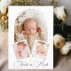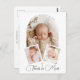 Nuestra hermosa tarjeta de agradecimiento para el bautizo es un hermoso recuerdo diseñado para capturar el preciado recuerdo del día especial de tu bebé. Esta tarjeta presenta tres fotos personalizadas de tu pequeño: una foto principal que se muestra en el centro dentro de un elegante marco blanco en forma de arco, con el nombre de tu bebé destacado en la parte superior en una fuente elegante en forma de semicírculo.