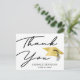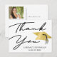 Tarjeta de agradecimiento de graduación minimalista elegante con tipografía moderna de escritura a mano, una gorra de graduación de falso foil metálico dorado y personalizada con el nombre de su graduado y año de clase en la parte frontal. El lado opuesto ofrece la opción de pre-imprimir su mensaje de agradecimiento o eliminar el texto de muestra para dejar el área en blanco para notas manuscritas de agradecimiento. Diseño negro, dorado y blanco. ASISTENCIA: Para ayuda con la modificación del diseño o personalización, cambio de color, transferencia del diseño a otro producto o si desea artículos coordinados, contacte al diseñador ANTES DE REALIZAR EL PEDIDO a través de la pestaña de MENSAJE de chat de Zazzle o envíe un correo electrónico a makeitaboutyoustore@gmail.com.