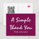 Si está buscando una tarjeta postal elegante, simple y bonita para agradecer a los clientes por sus negocios o apoyo continuo, puede apreciar esta Tarjeta Postal de Agradecimiento Empresarial de Color Vino con Letra Simple de Zazzle. Esta tarjeta postal elegante ofrece un código QR y texto que se puede personalizar fácilmente para satisfacer las necesidades de su servicio al cliente. Disponible en tipos de papel mate o semi-brillante. Se vende con o sin sobres, por tarjeta o en cantidades de 2-2000. Ligeramente rayada y con sello de corazón en la parte posterior para un toque de amor y la comodidad de escribir su dirección. Ideal para regalar durante interacciones cotidianas con clientes, acompañar pedidos o dar en fiestas o eventos especiales. Ahorre cuando compre más - sin mínimos. Garantía de satisfacción del 100%.
