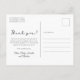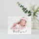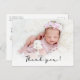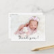 Simple Minimalista guión moderno foto bebé recién nacido Gracias Postcard. Presenta un texto de bonito "gracias" en un guión con letras a mano o con sobreposición de tipografía. Al revés, un mensaje personal prefabricado en blanco y negro. Fácil de personalizar con la foto y los detalles de tu bebé favorito.