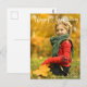 Tarjeta postal de foto elegante de Acción de Gracias feliz con tipografía cursiva hermosa en blanco sobre tu fotografía de otoño. Esta tarjeta plegable de fotografía familiar moderna de otoño presenta un guión hermoso y tu nombre en blanco sobre la imagen de vacaciones de temporada de sangrado completo.