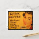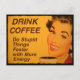 Mujer sonriente con lápiz labial rojo retro y uñas bebe su taza de café matutino. La leyenda dice "Beba café - Haz las cosas estúpidas más rápido con más energía".