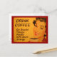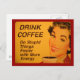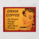 Mujer sonriente con lápiz labial rojo retro y uñas bebe su taza de café matutino. La leyenda dice "Beba café - Haz las cosas estúpidas más rápido con más energía".