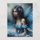 Un adorable hada fastidiada con un vestido de puntito de polka azul y blanco en el océano. Está molesta porque una ráfaga de viento la hizo volar al agua en lugar de aterrizar en la playa de arena.