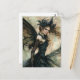Hermosa Hada que lleva un vestido verde oscuro y negro, tiene alas de encaje negro preciosas, cabello largo y fluido, orejas puntiagudas y plumas verdes oscuras en su cabello.