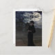 Un hada de cabello oscuro vestida con una larga bata negra se para a la luz de una luna llena cerca de una vieja puerta cubierta de hiedra mientras los murciélagos vuelan sobre sus cabezas.