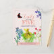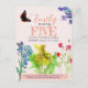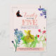 Invitación de cumpleaños con una pequeña hada de dientes de león y flores silvestres coloridas. Un feliz collage de pinturas acuarelas hechas a mano para la pequeña que celebra su quinto cumpleaños.