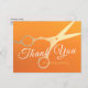 Salón de pelo / Hairstylist / Hairdresser / Salón de belleza / Artistas de maquillaje / Estilistas / Planificadores de bodas / Organizadores de eventos / consultores / propietarios de tiendas / Modas de moda Gracias Plantillas de postales - Moderno Faux Gold Scissors on Naranja Gradient Background.