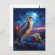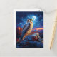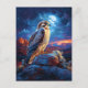 Un halcón solitario se perfila orgullosamente en una roca bajo un cielo estrellado por la noche, con una luna luminosa y un paisaje desierto colorido. El lugar desprende tranquilidad, naturaleza y belleza natural.