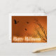 A Halloween silhouette illustration featuring spooky black bats and creepy trees with a drippy "Happy Halloween" Greeting on a mystic orange background.