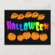 Happy Rainbow Halloween postal sobre un fondo negro con letras de arcoiris y calabazas naranjas.