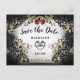 Halloween Elegante Guardar la postal de fecha coincide con la invitación. Este es un tema elegante para un boda de Halloween, presenta rosas negros y cuervos con apenas un toque de rojo. Fácil de personalizar de tu texto.
