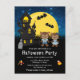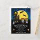 Esta divertida y espeluznante invitación a Halloween incluye a los adorables hombres de guerra junto a una casa embrujada y encantada. En el fondo hay una luna llena con murciélagos y un cielo azul nocturno con estrellas. El texto combina fuentes decorativas y serif para un estilo elegante y moderno. Esto es perfecto para Halloween.