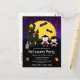 Esta divertida y espeluznante invitación a Halloween incluye a los adorables vampiros al lado de una casa embrujada y torcida. En el fondo hay una luna llena con murciélagos y un cielo nocturno morado con estrellas. El texto combina fuentes decorativas y serif para un estilo elegante y moderno. Esto es perfecto para Halloween.