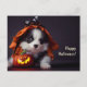 Postal Halloween Hund. Welpe mit Kürbissen. Niedlich.