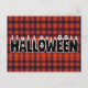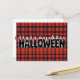 Festive Halloween postcard featuring ghost candle lettering on a bold red plaid background. Perfect for sending spooky greetings or decorating your seasonal stationery collection.