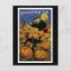 Ilustracion de tarjetas de felicitación de Halloween de época que muestra un truco o un traidor asustado por una bruja en un parche de calabaza de linternas.