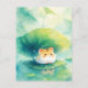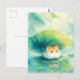 This heartwarming design features an incredibly sweet and round hamster shown resting peacefully on a vibrant green lily pad. Created as a high-quality digital illustration in a soft watercolor style, the hamster has fuzzy orange and white fur, tiny pink paws, and large, soulful dark eyes that sparkle with warmth. The character is cleverly seeking shelter under a massive, dew-covered green leaf that acts as a natural umbrella against a light mist. Tiny, shimmering water droplets and glowing light orbs drift through the hazy, sun-drenched teal and yellow background, creating a sense of quiet magic and natural wonder. The hamster's reflection is softly visible in the tranquil water below, adding a touch of peaceful depth to the scene. The overall aesthetic is tranquil, playful, and full of artistic charm, making it an exceptional choice for pet lovers and fans of whimsical woodland scenery. This whimsical hamster postcard is a perfect choice for sending a "thinking of you" note or a cozy greeting to a friend who finds joy in the simple magic of nature. You might choose to use this artistic card for a pond-themed birthday invitation or to celebrate a professional achievement with a touch of adorable elegance for your colleagues. It also makes a precious decorative piece for a child's nursery wall or a bright addition to a creative journal as a small token of rainy day happiness. This versatile design is also an excellent choice for a housewarming message, a baby shower thank you note, or as a heartwarming way to share a message of joy for any situation or event.