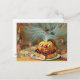 Happy Jack-o-Lantern se sienta encima de un pastel. Las brujas y los demonios vuelan sobre sus cabezas. Diseño personalizado de época.