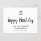 This postcard has text on both sides. Front: You can add your logo to this postcard. The logo will be above a script that says Happy Birthday. Two lines of display text are below the script for your personalized message. Back: The back has text you can edit to show your business name, special offer, offer terms, or a custom message. The postcard is white. The text is black.