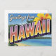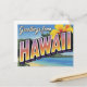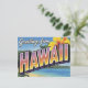This gorgeous, colorful retro-style design features the classic "Greetings from Hawaii" typography set against a stunning tropical beach landscape. The scene includes turquoise blue water, lush green mountains, and is beautifully accented by a large, vibrant yellow hibiscus flower, the state flower. Perfect for fans of vintage travel posters, retro artwork, beach vacations, and the natural beauty of the Aloha State. This is an ideal souvenir, gift, or memento for anyone who loves the Hawaiian Islands.