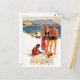 Hawaii, pareja de vacaciones en la costa, admirando la creación de niños nativos. Postal de viaje vintage.
