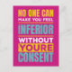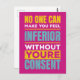 Esta postal es una poderosa declaración para los derechos de las mujeres. La inspiradora frase "Nadie puede hacerte sentir inferior sin tu consentimiento" está diseñada en un tipo de letra audaz con textura de arañazos, dándole una profundidad única. Contra un vibrante fondo rosado, las palabras destacan en llamativos colores como blanco, amarillo y azul claro - una combinación moderna y expresiva que refleja perfectamente el espíritu feminista. Es ideal para aquellos que defienden los derechos de las mujeres, los derechos al aborto y la igualdad. Con esta tarjeta postal, usted hace una fuerte declaración en apoyo de causas como "Mi cuerpo, mi elección", defendiendo a Roe v. Wade, y la incansable lucha por la salud de las mujeres y la autodeterminación. Es perfecto para mostrar tu activismo, ya sea por el Día de la Igualdad de la Mujer o en discusiones diarias sobre temas a favor de la elección y a favor del rol. Una obligación para cualquiera comprometido con un futuro justo.