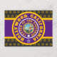 Postcard negro con diseño de círculos concéntricos morados, dorados y blancos sobre un rectángulo morado y dorado con "HOLLYWOOD, CALIFORNIA CENTER OF THE UNIIVERSE" con logos Y-NOT-ME en el fondo. Este diseño es un grito a Hollywood, California, la capital del mundo.