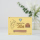 Esta postal celebra el estilo y la moda de los años 30 con un amplio gorra de estilo brim cloche, una radio de estilo art decó y un carrete de película para representar la era del cine en tonos marrones apagados y fondo de abadejo con bordes geométricos.