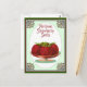 Mi interpretación de un paquete de semillas para semillas de fresa de Heirloom. Bonito bol de fresas con fondo de gingham verde y marco ornamentado.