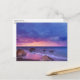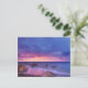 Una postal con una preciosa fotografía con llamativos colores morados, azules y rosas al atardecer. Una línea costera de bonito con rocas.