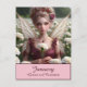 Un hermoso hada de pelo buff con alas blancas y de color burgués con un vestido de bonito burdeos y un collar de granate sostiene un clavel blanco mientras se pone de pie en un campo de claveles.