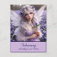 Un hermoso hada de lavanda pálida, con alas blancas y plateadas con un vestido de lavanda de bonito y un collar de amatista sostiene un solo violeta mientras se mantiene en un campo de violetas.
