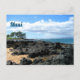 Este hermoso paisaje pintoresco presenta el océano azul detrás de asombrosas rocas negras en esta playa de bonito en Maui, Hawaii. Las nubes blancas se extienden por el horizonte y están iluminadas por la luz del sol que brilla hacia los verdes árboles del fondo costero.