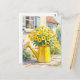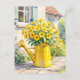 Una postal floral para mantenerse en contacto con amigos y familiares. Una encantadora ilustración de flores amarillas en una regadera amarilla que se encuentra afuera en el camino al lado de la casa. Una bonita ilustración de acuarela de verano.