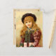 Postal ventilado adorable con un chica bonito, vestido con un traje elaborado con una pesada cruz dorada.