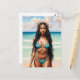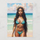 Esta postal presenta obras de arte al estilo de la pintura al óleo de un hermoso chica negro con el pelo largo con giros o tazas, usando un bikini verde azulado y una corona de flores. Ella está en la playa con el océano detrás de ella.