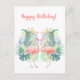 ¡Feliz cumpleaños! Tarjeta postal romántica con ilustración de acuarela "Hermoso cuento de hadas para dos flamencos", texto caligráfico - "Paz, alegría, amor", Dos hermosos flamencos rosados, flores exóticas tropicales, follaje, ornamento floral de jungla, jardín, verano, viaje, vacaciones, cumpleaños (regalos para ella). Invitaciones y papelería > Tarjetas postales. Plantilla de texto. Personalízalas agregando tu nombre. Decoración gráfica de dos lados.