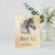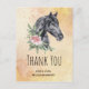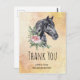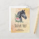 Gracias postal con un hermoso ilustracion de cabeza de caballo negra con un lujoso adorno floral por su cuello. Elegante y elegante pintura de animales. El fondo es un diseño abstracto y elegante de un color amarillo claro con faldas de oro falsas.