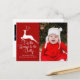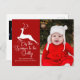 Un elegante ciervo blanco salta por encima de las palabras de los Navidades Esta es la temporada para ser alegre en esta hermosa postal de vacaciones. Clásica elegancia con un reno de bonito sobre una magnífica caligrafía y una foto familiar llenando el frente de esta clásica postal roja. La parte de atrás es una segunda fotografía y el mensaje de su personalizado.