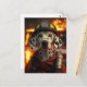Un valiente perro dálmata vestido de bombero, parado frente a una escena en llamas con chispas volando. El perro lleva casco de fuego y equipo de protección, simbolizando coraje y heroísmo.