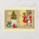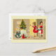 Diseñado por Susan Epps Oliver. Navidades alemanes vintage se asoman a una habitación donde un árbol de Navidad está rodeado de regalos y juguetes, incluido un mecedor. El mensaje es "Herzlichen Weihnachtsgruss".