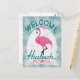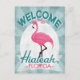 Hialeah Florida flamingo rosa. En el estilo vintage de los posters de viaje, dice "Bienvenidos a Hialeah, Florida" en color turquesa rosa, blanco y verde menta.